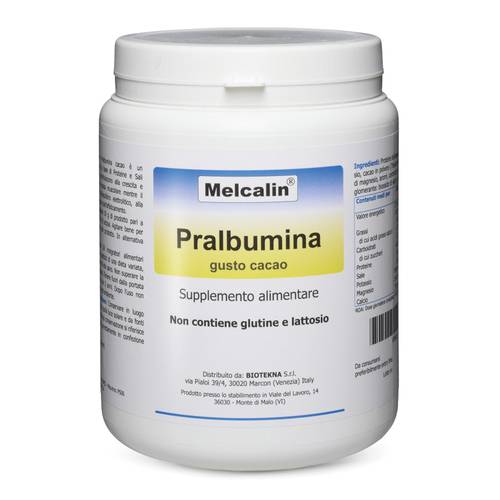 Melcalin PralbuminaGUSTO CACAO Descrizione Supplemento alimentare a base di proteine e sali minerali. Le proteine contribuiscono alla crescita e al mantenimento della massa muscolare. Il magnesio contribuisce all'equilibrio elettrolitico, alla riduzione della stanchezza e dell'affaticamento. Ingredienti Proteine dell'uovo, bicarbonato di potassio, cacao in polvere (Theobroma cacao L.), carbonato di magnesio, aromi, carbonato di calcio, agente antiagglomerante: biossido di silicio, edulcorante: sucralosio. Caretteristiche nutrizionali Valori medi per 100 g per dose giornaliera 19 g %VNR* 19 g Kcal 277 kcal 53 kcal ...